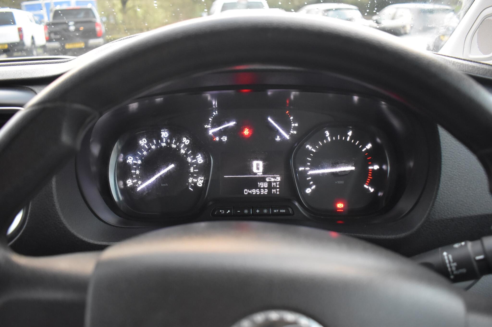 16in Steel Wheels with Centre Caps, Air Conditioning, Anti-Theft Spare Wheel Cradle, Bulkhead - Full Height Steel without Window, Cab Headliner, Cab Soundproofing, Coolant Temperature Warning Light, Daytime Running Lights, Driver Seat - Height - Reach - Backrest Recline - Lumbar Adjustment - Driver Seat Armrest - Padded Head Restraint, Drivers and Front Passengers Airbags, ESP - Electronic Stability Programme Plus with Traction Control, Electric Windows - Front with One Touch Facility, Electronic Engine Deadlock Immobiliser, Facia Mounted Gear Lever, Facia Storage, Fixed Floor-Mounted Load Restraint Lashing Eyes, Floor Mounted Handbrake Lever, Four-Channel Anti-Lock Braking System - ABS, Front Door Pockets, Front Fog Lights, Fuel Economy Gauge, Fuel Gauge with Low Fuel Warning Light, Full Size Spare Wheel, Hazard Warning Lights, Height Adjustable Outer Front Seatbelts, High Beam Assist, High Level Brake Light, Hill Start Assist, Hydraulic Power-Assisted Rack and Pinion System with Energy Absorbing Steering Column, Inertia-Reel Lap and Diagonal Seatbelts, Lights On Audible Warning, Lockable Fuel Filler Cap, Manually Foldable Electrically Adjustable-Heated Door Mirrors, Multi-Function Trip Computer, Multimedia, Nearside and Offside Sliding Side Access Doors, Reach and Rake Adjustable Steering Wheel, Rear Fog Lights, Rear Parking Distance Sensors, Remote Control Central Deadlocking, Rev Counter, Roof-Mounted Flexible Aerial, Seats - Dual Front Passengers Bench with Underseat Storage, Security Alarm System, Selective Door Locking, Side Protection Mouldings, Side Repeat Indicators, Speedometer, Steering Column Lock, Twin Reversing Lights, Unglazed Rear Doors - 90-180 Opening, Vauxhall Connect, Visibility Pack, e-Call and b-Call
